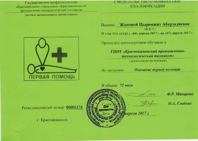 4. Апрель 2017 г. Курсы повышения квалификации в ГПОУ «Краснокаменский промышленно-технологический техникум» по программе «Оказание первой помощи» в объёме 72 часов. Свидетельство о повышении квалификации рег. Номер 00001174 от 07 апреля 2017 г.