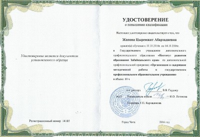 2. Октябрь 2016 года. Курсы повышения квалификации в государственном учреждении дополнительного профессионального образования «Институт развития образования Забайкальского края» по дополнительной профессиональной программе «Организация и содержание методической работы в государственном профессиональном образовательном учреждении» в объеме 60 часов. Свидетельство о повышении квалификации, регистрационный номер № 14185.