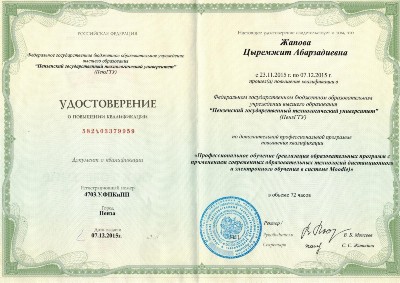 1. Декабрь 2015 год. Курсы повышения квалификации в федеральном государственном бюджетном образовательном учреждении высшего профессионального образования «Пензенский государственный технологический университет» (ПензГТУ) по дополнительной профессиональной программе «Профессиональное обучение (реализация образовательных программ с применением современных образовательных технологий дистанционного и электронного обучения в системе Moodle)» в объеме 72 часов. Удостоверение о повышении квалификации, регистрационный номер 4703.У.ФПКиПП от 07.12.2015 г.
