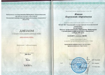 3. Февраль – март 2017 г. Курсы профессиональной переподготовки в ФГБОУВО «Пензенский государственный технологический университет» по программе «Педагог профессионального образования. Информатика в организациях профессионального образования» в объёме 288 часов. Диплом о профессиональной переподготовке 582405015234, регистрационный номер №. ДП-1914 от 16.03.2017 г.