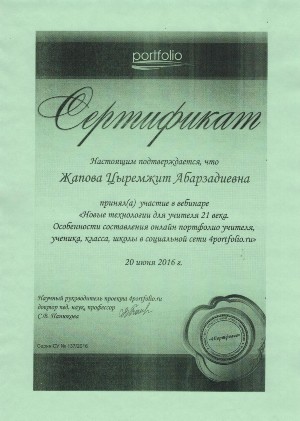 2016 год. Сертификат участия во Всероссийском вебинаре «Новые технологии для учителя 21 века. Особенности составления онлайн портфолио учителя, ученика, класса, школы в социальной сети 4portfolio.ru»
